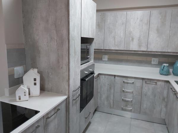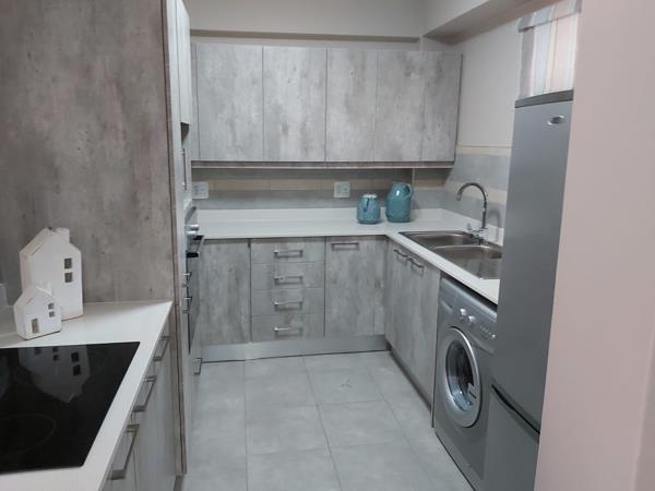 Open-plan kitchen with built-in cupboards (space for microwave, fridge and washing machine),