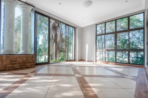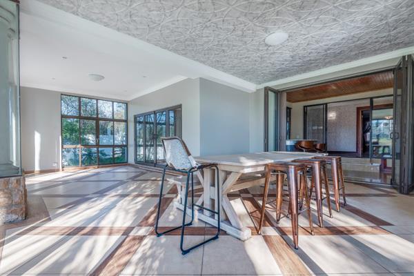 Enclosed sun-filled patio with a built-in bar, flowing seamlessly into the entertainment spaces.