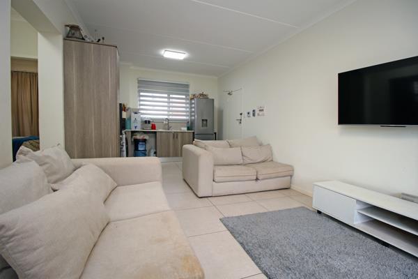 The open plan kitchen and lounge create a warm, spacious feel. The kitchen has modern finishes, space for a washing machine and dishwasher, and comes with blinds. The lounge has curtain rails, a sliding door to the garden and washing line, and a second door leading to the parking area.