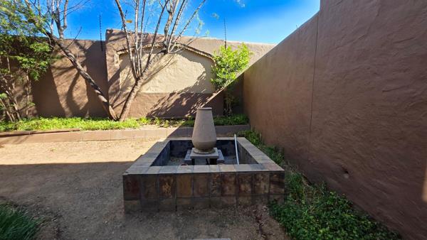 The lounge/dining room area opens up onto an enclosed patio/entertainment area with a large fountain.