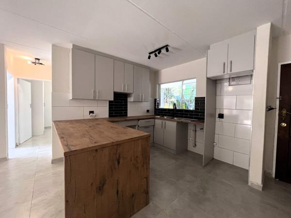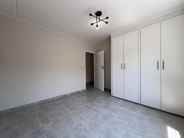 The private garden entrance with a covered patio and manageable garden opens into a sunny, spacious living area, newly tiled throughout with large-format light grey tiles. The kitchen, too, has been renovated into a pleasing, modern open-plan cooking area. Ample cupboards, working space with wide counters and a place for a double fridge make this area special. The back door of the unit opens out to an enclosed courtyard for additional space and storage, adding versatility to everyday living.