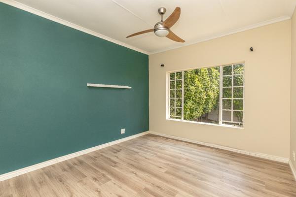 There are two bedrooms, each with laminate flooring and generous built-in cupboards, as well as a full bathroom with both a bath and shower.