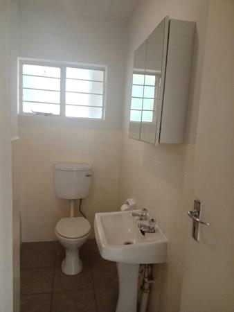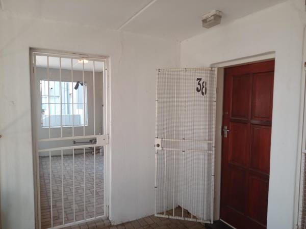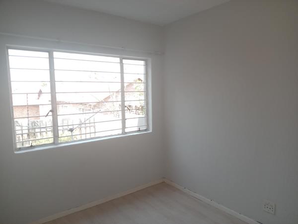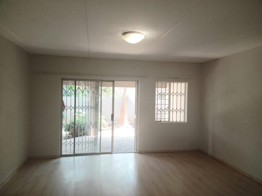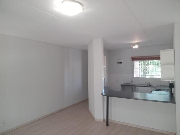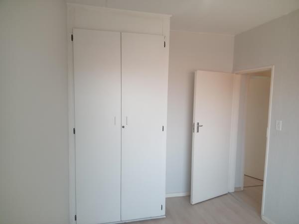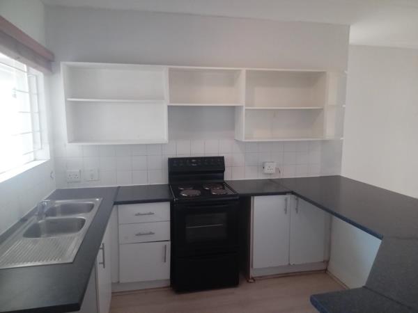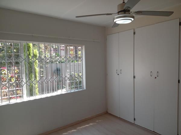 It features two spacious bedrooms with fitted cupboards, a full bathroom with a basin and a shower, an open-plan kitchen and lounge, an extra storage room and a private back patio.