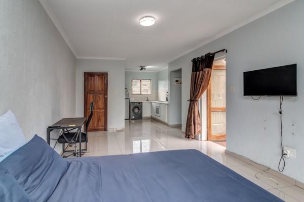 This fully tiled unit offers a spacious open-plan layout, providing ample room for a bed, lounge or dining suite, and a dedicated work area. While there is no separate bedroom, the clever design maximizes space and functionality