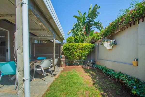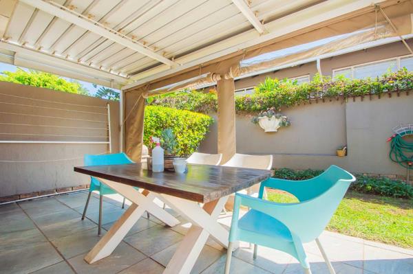 -A covered patio with adjustable awning, opening onto a lush private garden perfect for relaxing or entertaining.