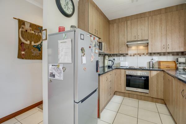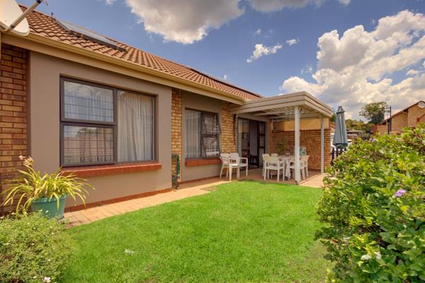 Outdoor living is a delight with a private, well-maintained garden and a covered patio, ideal for relaxation or entertaining. Additional paved areas and a pergola offer versatile outdoor options. The property includes a single garage and an additional parking space, adding convenience. Practical features such as security bars on windows, security gates, and a solar geyser contribute to both safety and energy efficiency.
