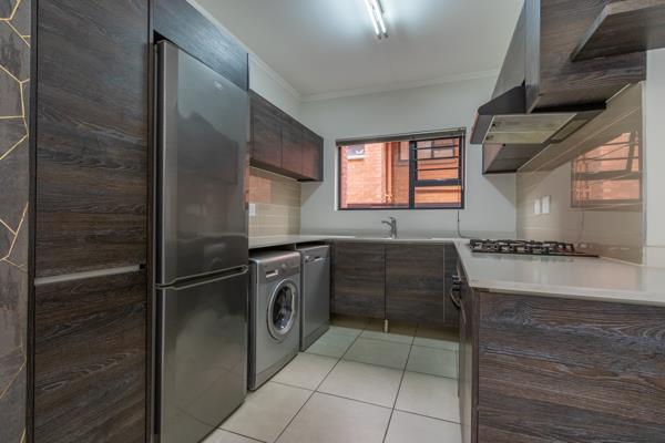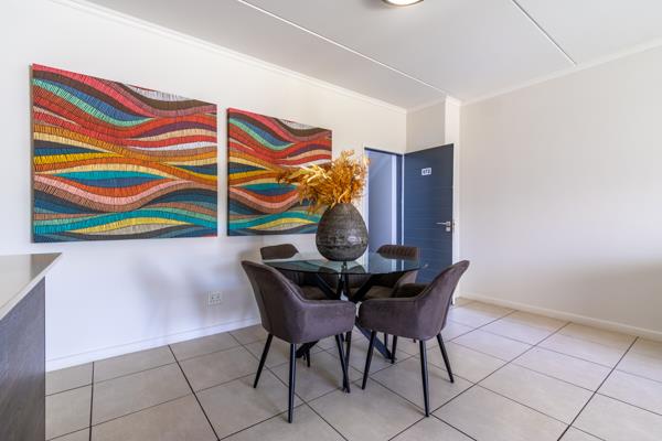 An open-plan kitchen and living area. The living area can easily accommodate a lounge set-up of your choosing. The living area leads onto a spacious patio that leads onto your private garden.