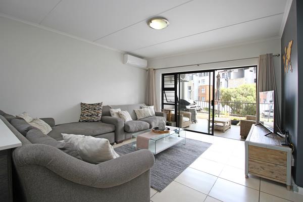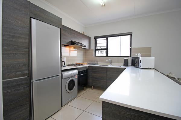 The apartment features two spacious bedrooms with dark wood built-in cupboards. The main bedroom opens onto a private balcony, while the two contemporary bathrooms include a main en-suite with a shower and a second full bathroom with both a bath and shower. The sleek open-plan kitchen boasts Caesarstone countertops, a gas stove, and ample cupboard space, flowing seamlessly into the bright lounge area with an air conditioner and access to a private balcony. Additional features include 2 covered carports, gas geyser for reduced electricity costs, fibre and DStv connectivity.