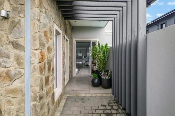Discover an exceptional opportunity within secure Olivewood Estate, offering a blend of modern living and family-centered amenities. This contemporary, two-story Smart Home, spanning a generous 341 sqm under roof on a 382 sqm erf, presents a sophisticated facade with grey tones, elegant stone cladding, and a welcoming entrance featuring a stone-clad wall and modern vertical slats leading to the front door. Ample parking is provided with a double auto garage and a carport, plus additional parking ensuring convenience for residents and guests. The tiled garage includes built in cupboards for extra storage.