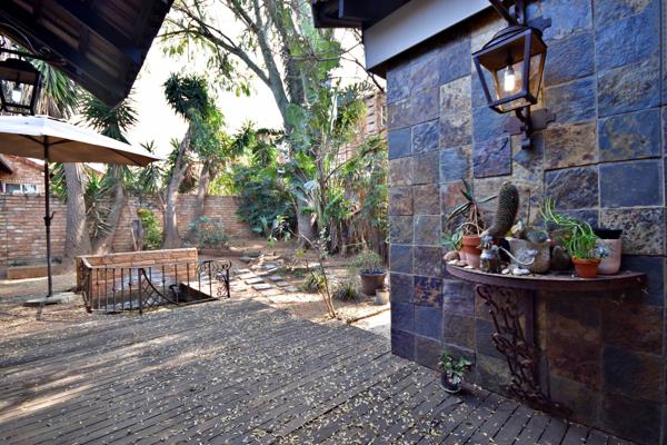This townhouse has a tiled open plan lounge and dining area, overlooking a patio which is finished in decking the patio backs onto a very spacious fully enclosed entertainment area, with views of the garden and built-in pond, perfect for entertaining. The garden is edged with trees, ensuring privacy, and would welcome a homeowner with green fingers.