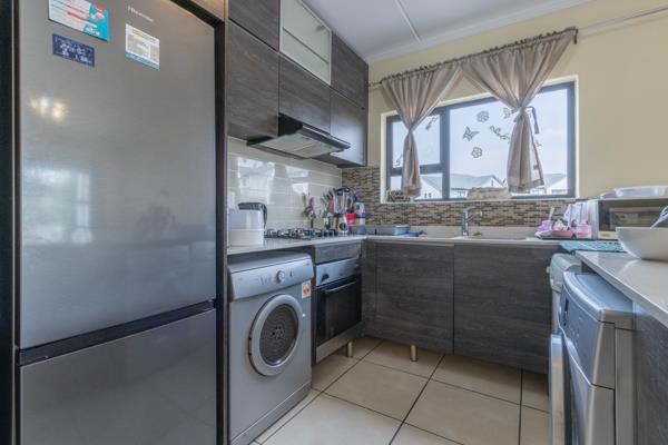 The kitchen is fitted with a gas stove and electric oven and includes appliances such as a tumble dryer and fridge.