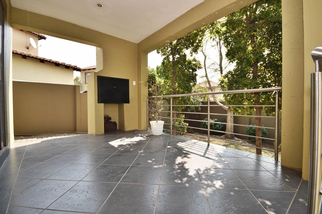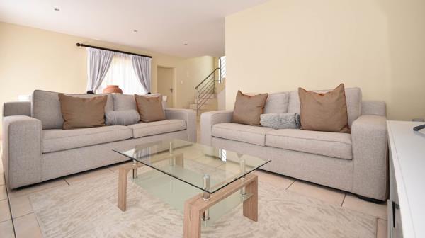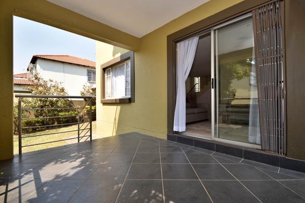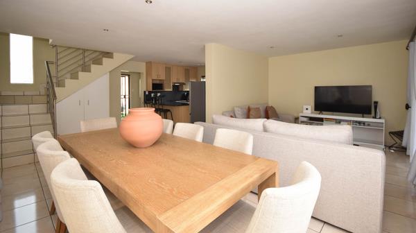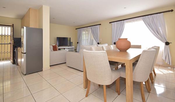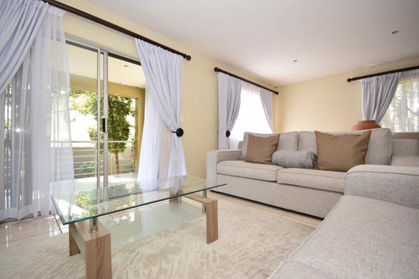 The spacious open-plan lounge and dining areas flow effortlessly onto a sunny patio featuring a built-in braai and a beautifully maintained garden adorned with trees and shrubs. This peaceful outdoor space is ideal for early morning meditation or relaxing sundowners on warm evenings.