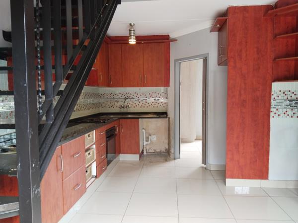 The main bedroom offers generous cupboard space and a modern en-suite bathroom featuring a large shower, toilet, and basin with elegant tiled finishes. Upstairs, the loft-style second bedroom is bright and versatile ideal as a guest room, home office, or creative studio.