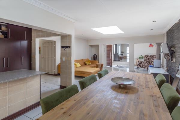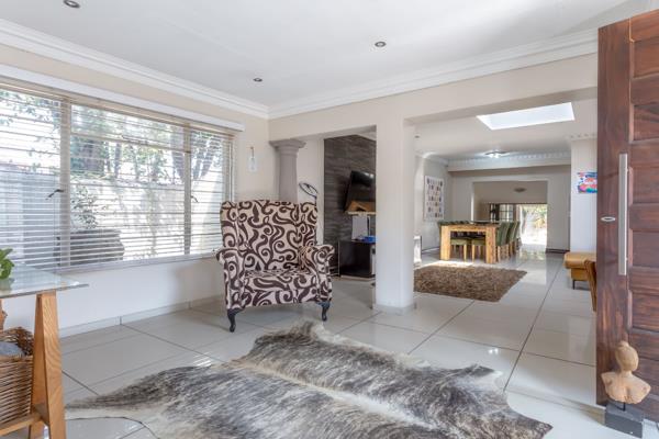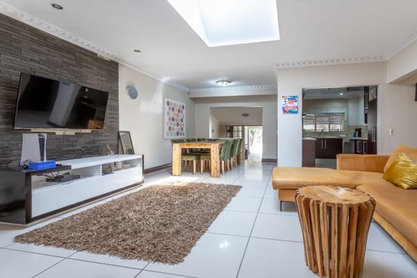 Youre welcomed by an inviting entrance hall that leads to a generously sized lounge, complete with a cozy fireplace the perfect space for winter gatherings. To the right, the home unfolds into a TV lounge, dining area, and an open-plan kitchen finished with Caesarstone countertops, ample cupboard space, and room for an undercounter appliance. A large adjoining scullery provides additional storage and accommodates two more appliances.