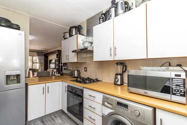 Upon entry you are welcomed by the modern kitchen with a gas stove, extractor fan, under-counter oven, double sink, breakfast bar, with space for 2 under-counter appliances, space for a single door fridge with plenty of cupboard space