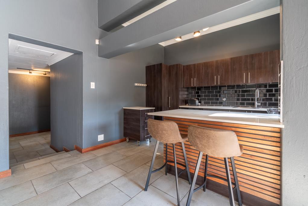 The stylish kitchen offers dark wood cabinetry, stone countertops, black subway tiles, and a peninsula counter with seatingperfect for casual dining and entertaining.
