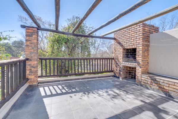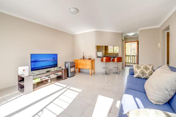 The apartment features an open-plan lounge with tiled flooring throughout, leading to a private balcony with built-in braai perfect for outdoor relaxation. The kitchen includes a breakfast nook and space for a single-door fridge.