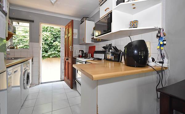 The open-plan kitchen has room for a single door fridge, and two white appliances there is a breakfast nook and ample cupboard space. The kitchen requires a little TLC.
