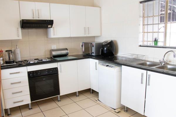 A beautifully finished kitchen with ample cupboards, pantry cupboard and space for two appliances.