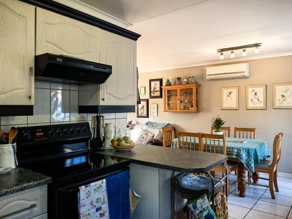 This well maintained, gem is nestled in a secure complex with 24hr security. From rising to resting your head on the pillow you will hear the gentle rustling and chirping of birds. Enjoy the quaint garden from the vantage point of your fabulous patio. Or lounge comfortably in the open plan living area that is large enough for a large lounge suite and 6seater dining. The well-appointed kitchen is cozy and has everything you need. This home oozes peace and calm.