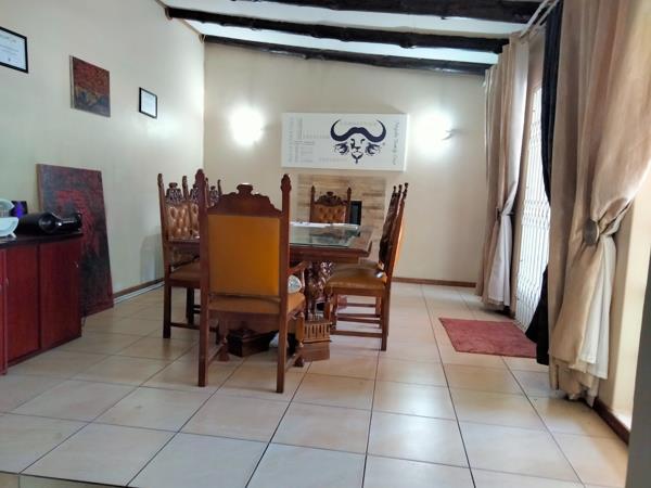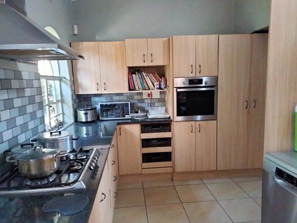 You enter a well space out dining room with easy access to the kitchen and the covered patio. Kitchen has a gas stove, single eye-level oven and space for 3 appliances. The split level lounge has a beautiful view to the garden, pool and covered patio with a built-in spit braai. Entertainment for all seasons!!