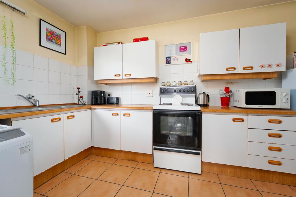 Spacious and bright both bedrooms are carpeted and include built in cupboards with ample storage. Fully fitted kitchen - functional and neat , the kitchen is equipped with solid cabinetry, an electric stove and oven, microwave shelf, space for appliances and charming wooden counter tops.