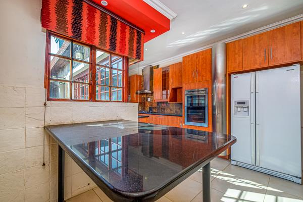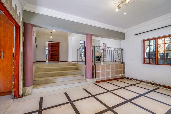 4 spacious reception areas including a built in bar with fridge and shelving which walks out onto huge covered patio with plumbing and built in servers and braai overlooking pool, jacuzzi and additional lapa with fire pit and guest loo.. Large, modern eat-in kitchen with separate laundry leads onto dining room and Pyjama lounge. Three spacious Lounge areas (1 with fireplace) one of which would be a great cinema room.