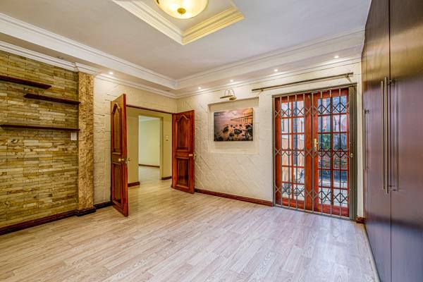 Main en suite is excellently proportioned with stylish cupboards and doors leading out to jacuzzi and lush Koi pond. Majestic double volume en suite bathroom with double vanity. 2nd en suite with exterior entry and full bathroom - 3rd bed has own bath over the passage. - also easy access to PJ lounge and dining.
