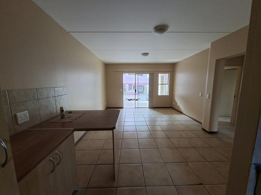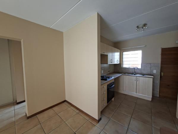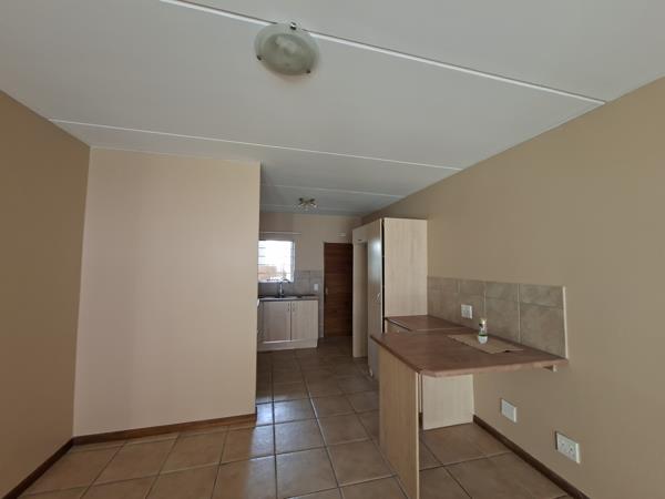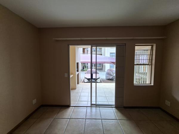 The open-plan kitchen is a highlight, offering a breakfast nook, ample cupboard space, a stove and oven, and plumbing for two appliances. This seamlessly flows into the tiled living area, which has sliding doors that open to a covered patio with a built-in braai, perfect for entertaining.