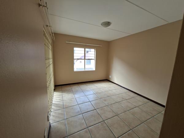The spacious main bedroom includes built-in cupboards and a sliding door that also leads to the patio. It also has a private en-suite bathroom with a shower, toilet, and basin. The second tiled bedroom also has built-in cupboards, and the second bathroom offers a bath, toilet, and basin.