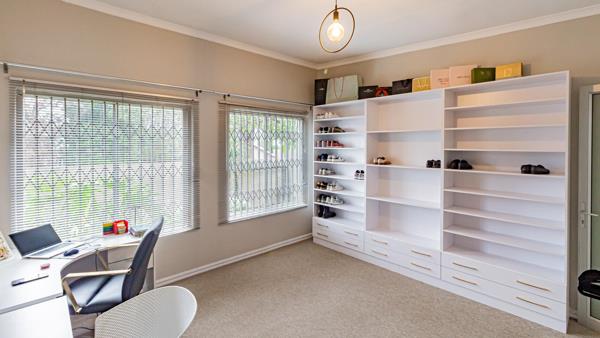 The rear garden is a realm of its own, meticulously planned for complete living. It features a dedicated staff room, a substantial laundry room with ample storage, and a practical double gas cylinder cage serviced by a gas geyser. Every detail has been considered for effortless living.