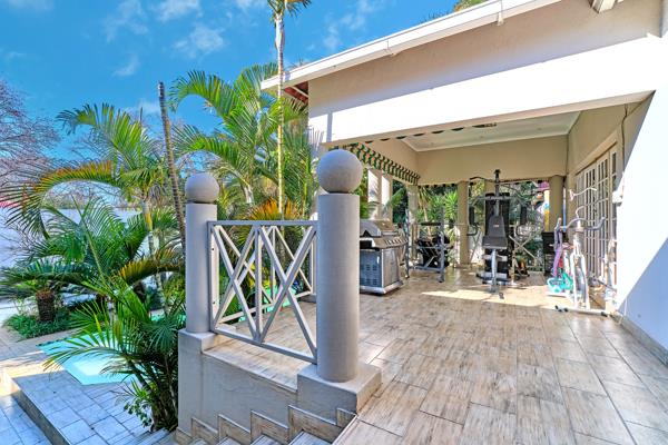 The spacious interior boasts four generously sized bedrooms with built-in cupboards and air conditioning, three elegant bathrooms, three lounges, a study, and a sunroom overlooking the landscaped garden and heated pool. The open-plan kitchen is a chefs dream, featuring stone countertops, dual ovens, a gas hob, and a scullery, with an adjoining outdoor cooking area.