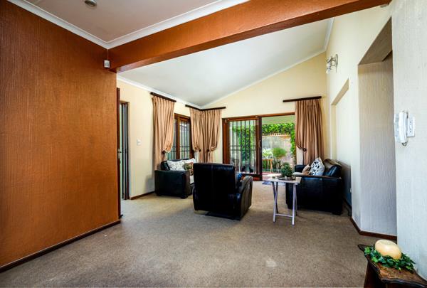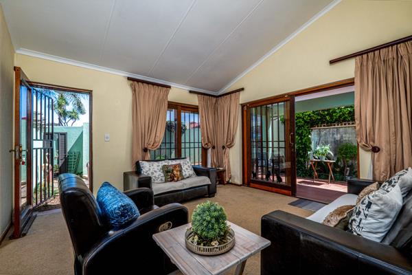 Follow the path leading to the entrance of this lovely cluster home. Inviting open plan living areas fitted high ceilings & slider doors, opening onto covered patio overlooking sparkling pool, braai facility & manicured garden.