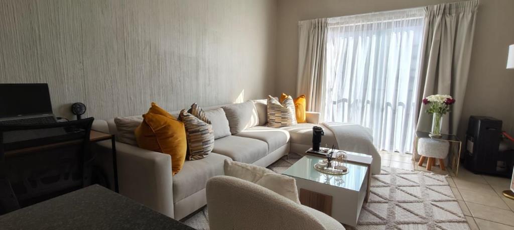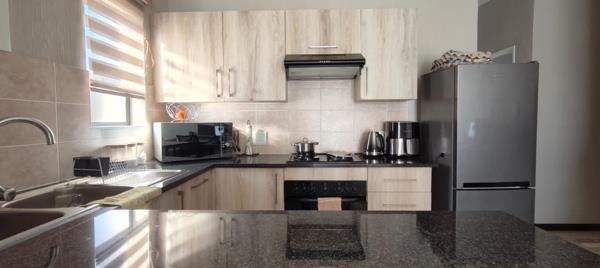 The open-plan layout creates a seamless flow between the lounge and modern kitchen perfect for casual entertaining or quiet nights in. The kitchen is thoughtfully designed with ample cupboard space, making it both functional and stylish.