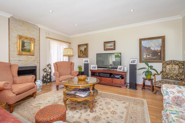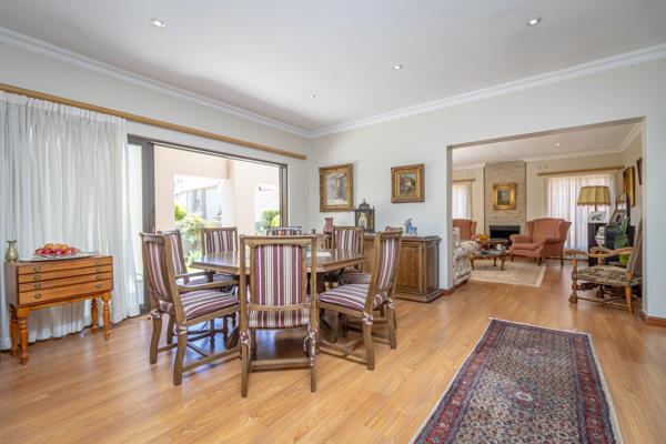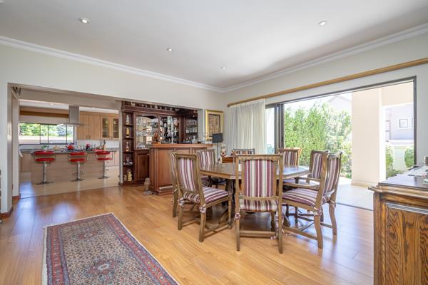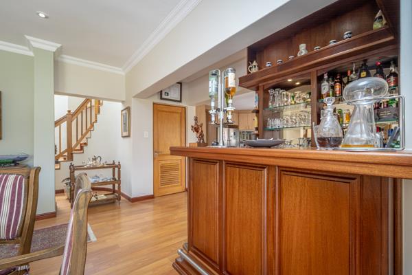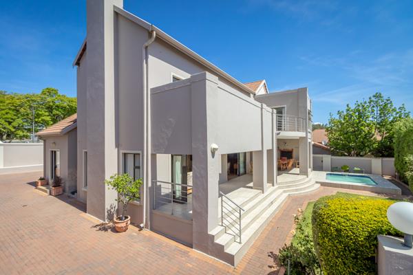 The ground level features expansive living areas (a front door into double volume entrance hall), seamless indoor-outdoor flow with stacking doors, open-plan sunlit lounge, dining room, a beautiful gourmet kitchen with solid oak cupboards, high-end appliances and a large separate scullery. All areas flow onto large covered patio overlooking a pool. There is a ground floor bedroom and guest toilet.