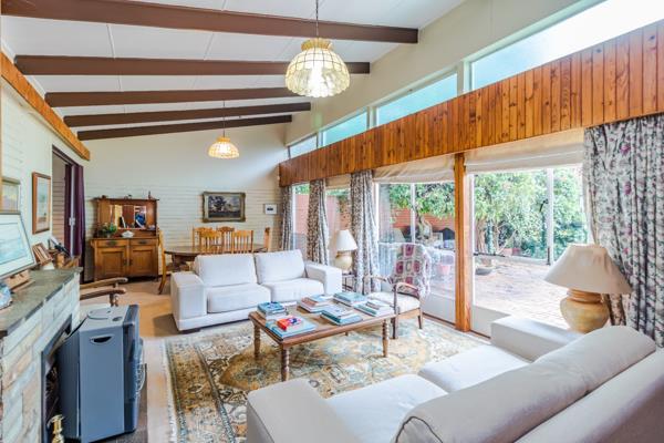 Inside, the home presents a welcoming layout with three comfortable bedrooms, two bathrooms, and a convenient guest toilet. A dedicated study provides an ideal space for work or quiet contemplation. The heart of the home features an open-plan lounge, dining room, and a separate family TV room, all benefiting from high vaulted ceilings with exposed beams and abundant natural light through large windows. A functional fireplace adds warmth and character, while the kitchen offers ample counter space and a large window overlooking the verdant garden.