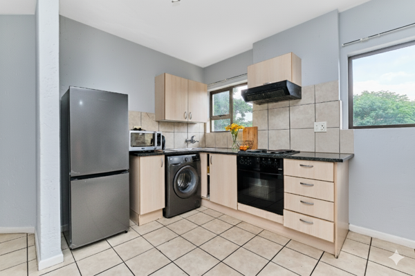 Step inside to a bright and spacious open-plan lounge and kitchen area, where sleek tiled floors and modern finishes create a welcoming flow. Sliding doors lead onto balcony with stairs down to a private, tiled patio perfect for morning coffee, relaxed evenings, or entertaining friends.
