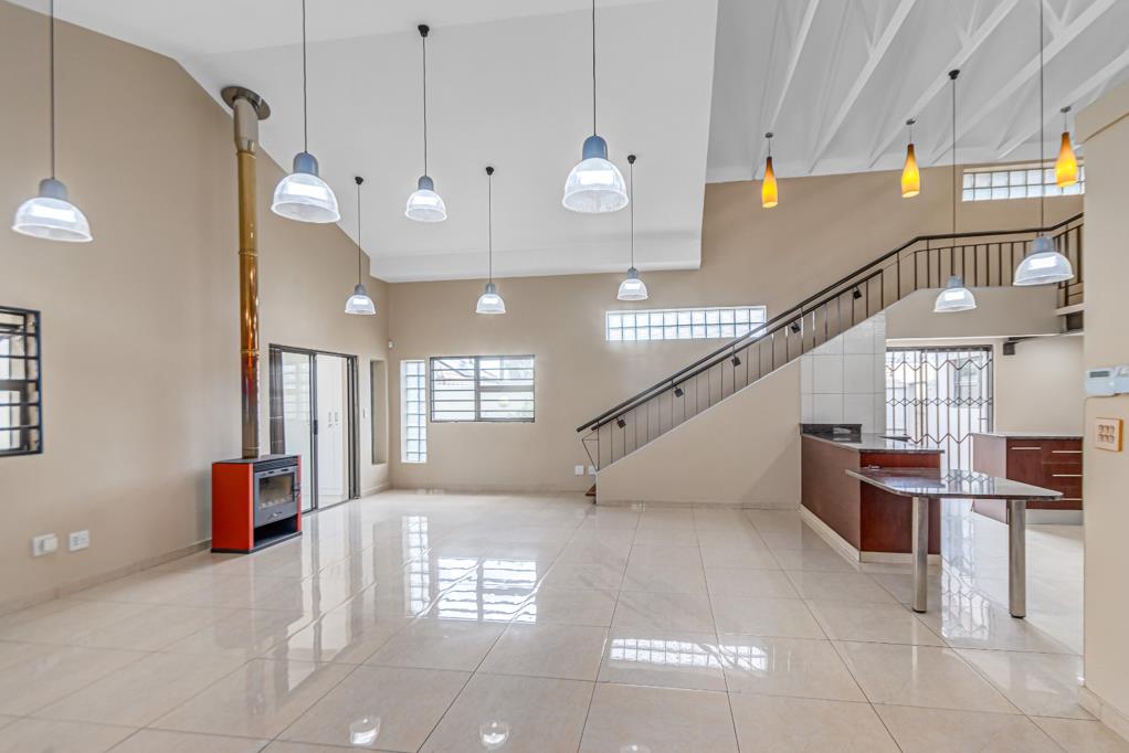 At the centre of the home is a bright double volume living area, enhanced by elegant lighting and a cozy fireplace. This flows naturally into a sunny entertainment room, ideal for gatherings, family time or peaceful afternoons. The home also includes a reliable inverter system with a lithium battery, adding convenience during load shedding.
