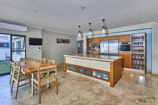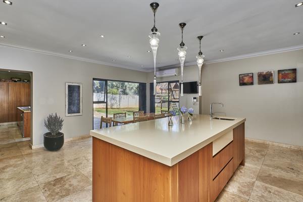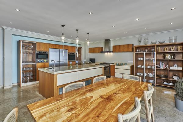 A well-manicured garden leads to a grand entrance, inviting residents and guests into an oasis of comfort and elegance. Impeccable finishes adorn this residence, featuring an open-plan lounge that is bathed in natural light, creating a bright and airy ambiance. A modern fireplace serves as the focal point, offering a cozy retreat during cooler evenings. The dining area, strategically positioned between the kitchen and lounge, provides a perfect setting for both intimate family meals and larger gatherings. Adjacent to the living area is a state-of-the-art eat-in kitchen, equipped with top-of-the-line appliances, custom cabinetry, and a spacious island perfect for both casual dining and entertaining.