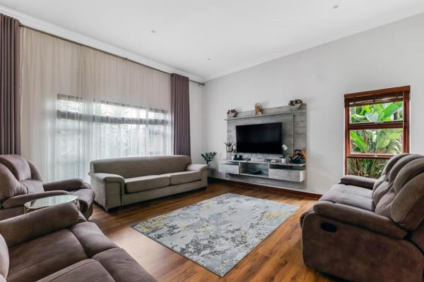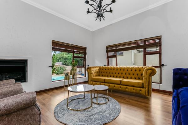 Entertainment is a breeze! The dining area opens to a covered patio with a built-in braai, featuring glass stacking doors that fully open to the lush garden and sparkling swimming pool. A convenient guest cloakroom is located downstairs.