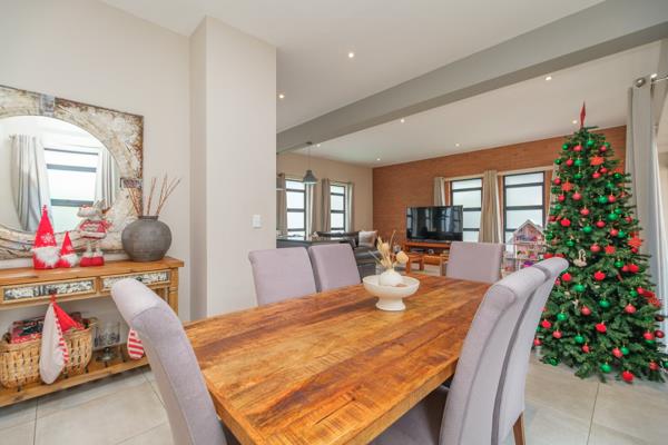 With 274 sqm of fully tiled, low-maintenance living, this home sits proudly on a private pan-handle stand secured by electric fencing and an alarm system for total peace of mind. The double garage offers direct access and extra storage, while the open-plan lounge and dining room glide effortlessly onto a covered patio fitted with a built-in braai - ideal for those who believe every season is braai season. The sleek kitchen boasts granite countertops, a breakfast counter, a separate scullery, an AEG gas hob with an electric oven, and plenty of cabinetry to keep life clutter-free. Upstairs, a cozy PJ lounge or study awaits, along with a dreamy master suite featuring a balcony and luxurious en-suite, plus two family bedrooms, each spoilt with its own en-suite bathroom.
