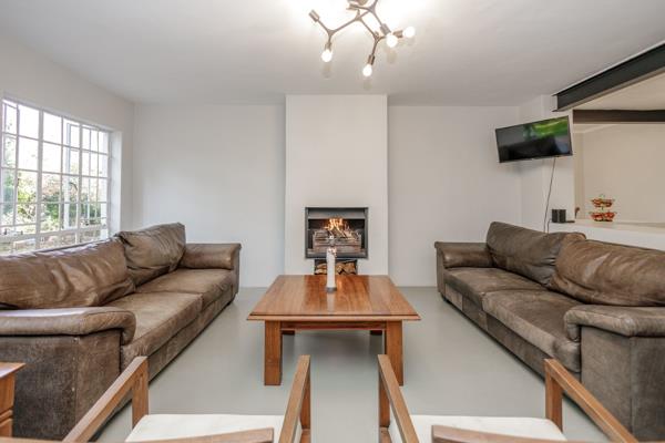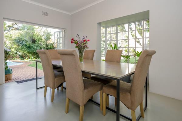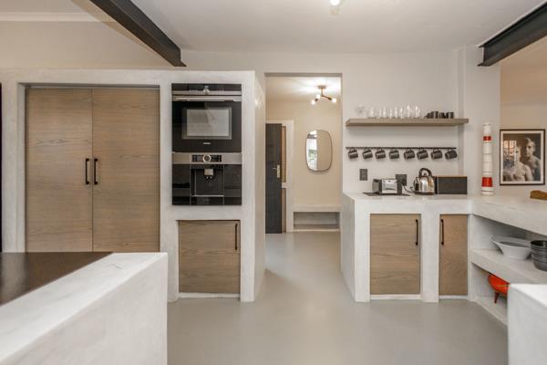 The entrance displays open plan clutter free living. Pristine kitchen with Bosch/Siemens appliances, including 5 gas plate hob, electric oven, has a built-in combination microwave and coffee machine. The breakfast nook completes the space. Dining and living spaces are open plan and integrated with doors leading out to the established garden.