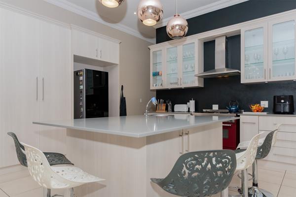 Enjoy indoor-outdoor living with a covered patio and landscaped garden. All bedrooms are en-suite, and the main suite boasts a private patio. With solar panels, an inverter, prepaid electricity, and strong security, this is an ideal energy-efficient family home. Includes domestic quarters and a double garage.
