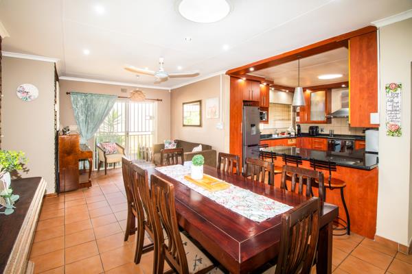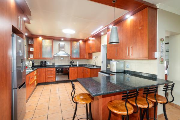 This modern family residence is bathed in natural light and features a tiled family room with a fireplace, a dining room and a TV Room. The kitchen is elegantly tiled and is equipped with granite tops, a breakfast nook, a stove with an extractor fan and a scullery. Additionally, there is a spacious laundry with built in cupboards. The house comprises four generous sized tiled bedrooms, each with built in cupboards, blinds and ceiling fans. The bedrooms are serviced by three bathrooms, two of which are en-suite. The fourth bedroom, along with its en-suite bathroom and the laundry room can be converted into a flatlet.
