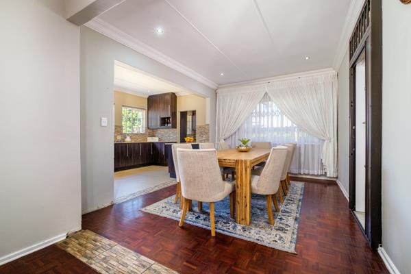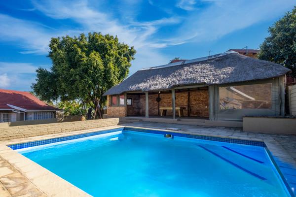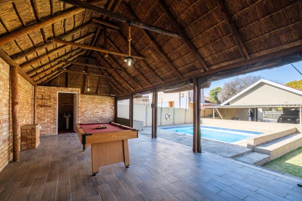 Charming Move-in Ready Home! Welcoming front door leads to entrance where a mixture of parquet & tile flooring flows to sun-splashed lounge & wood-burning fireplace. From here glass doors open onto garden, pool & Lapa entertainment area. The Lapa area is fitted with a pool table roll-up canvass sheets & guest loo that allows for all year round entertaining.