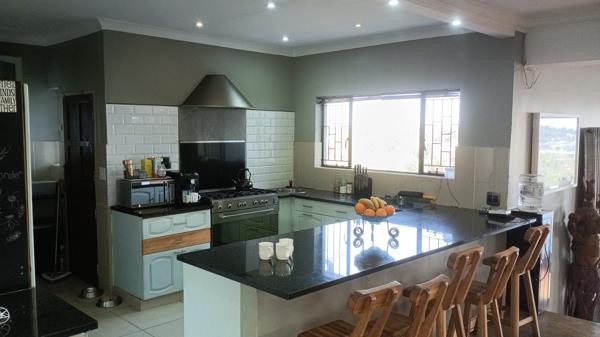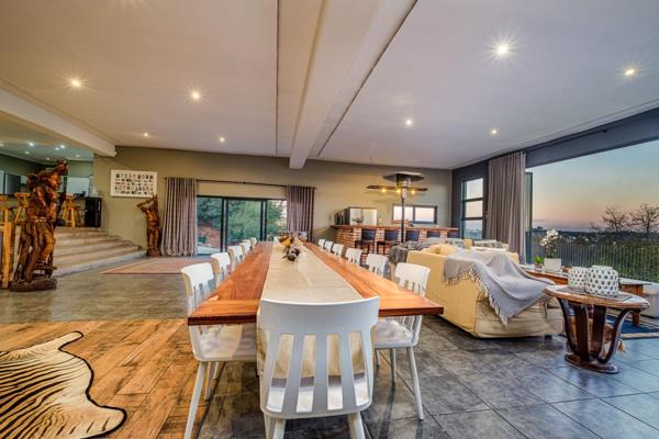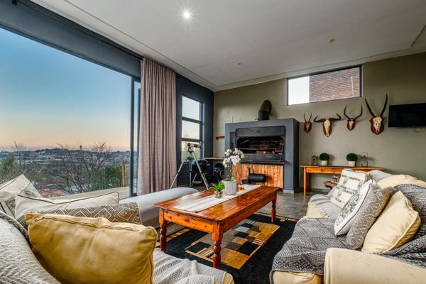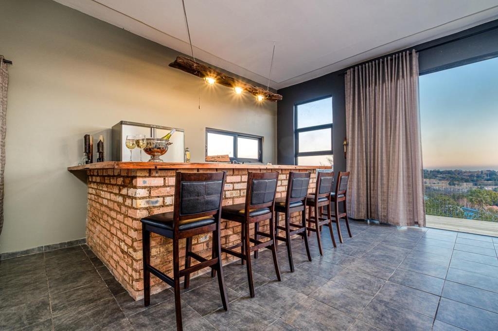 The living area is a true masterpiece, featuring an upper floor with raw cement/screed and a beautifully tiled lower floor. The unique design elements extend to the impressive bar area, which showcases exposed brick and a handcrafted sleeper top made from Cape Iron Wood, complemented by a rustic sleeper/industrial suspended light.