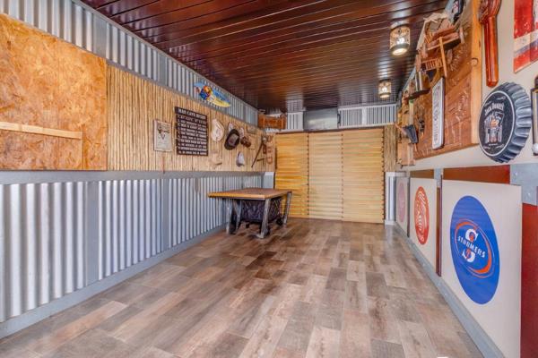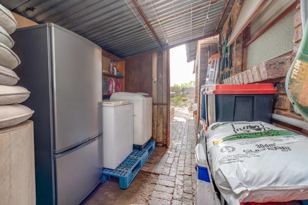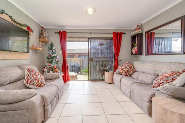 The tiled open-plan lounge opens onto a beautifully manicured private garden featuring a splash pool and a boma braai area, perfect for relaxed outdoor living and entertaining. An outside laundry adds convenience and practicality.