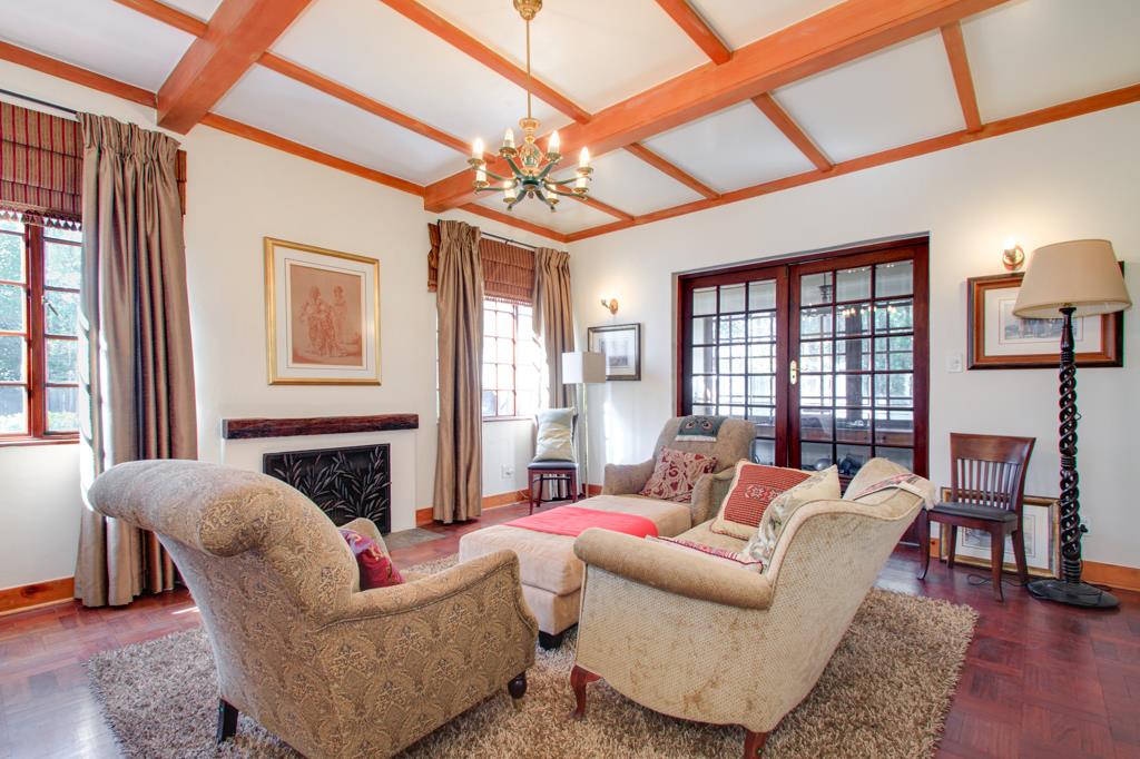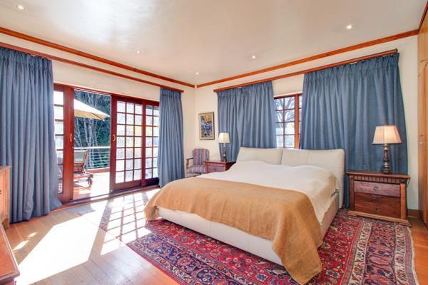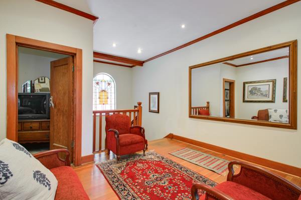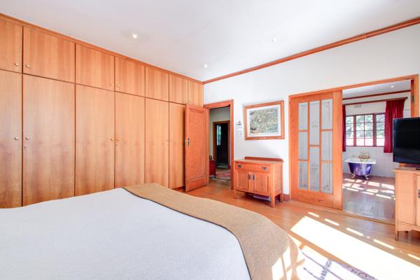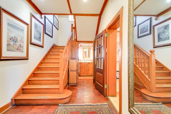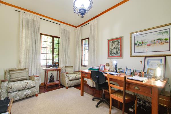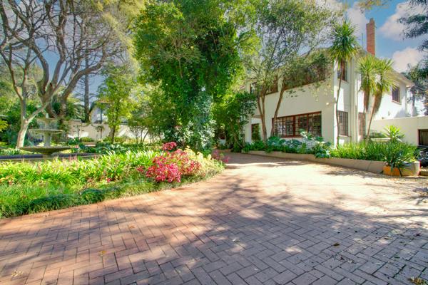 Set behind high walls amid a forest glade, this property offers many possibilities from a luxe guest house, an income spinner (R30 000 from the cottages alone) and work from studio and office. With a circular drive and feature fountain that draws you towards the entrance, this home offers original wood floors and frames with all the accouterments only found in period home. The hall way leads to the formal dining room through the elegant lounge with fireplace. Study and formal office. Guest loo. The kitchen with separate laundry flows perfectly to the enclosed entertainment area, with dining and sitting areas, opening trough French doors to the resort style garden and pool. The feature staircase with original stain glass window leads you to the spacious landing and 3 bedrooms that are all en suite and offering plentiful cupboard space. The feature main with a dressing room has enormous balcony with inspired views.