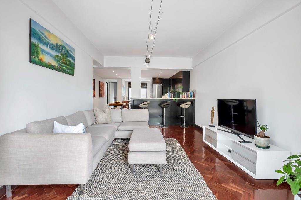 The kitchen is sleek and practical, with Caesarstone countertops, a breakfast bar, good cupboard space and room for both washing machine, dishwasher and fridge. There is also space for a dining-table.