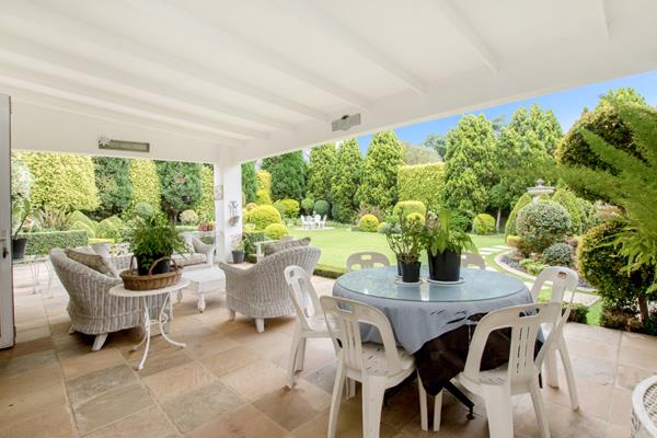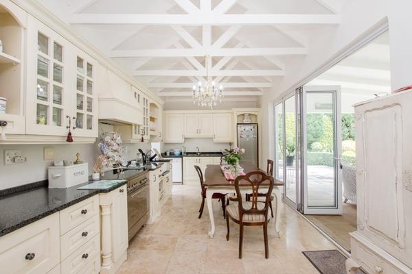 French-inspired touches throughout. A large country-style kitchen with exposed beams, a 90cm oven, and stacking doors opens onto a covered veranda overlooking the breathtaking, private back garden. Adjoining the kitchen is a lovely family room perfect for casual family time and tv.